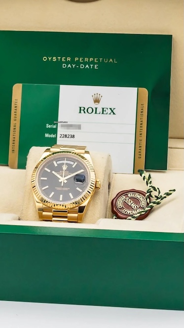 yellow gold 40mm case, fluted bezel, champagne dial with Roman numerals, automatic calibre 3255 movement, and iconic President bracelet.